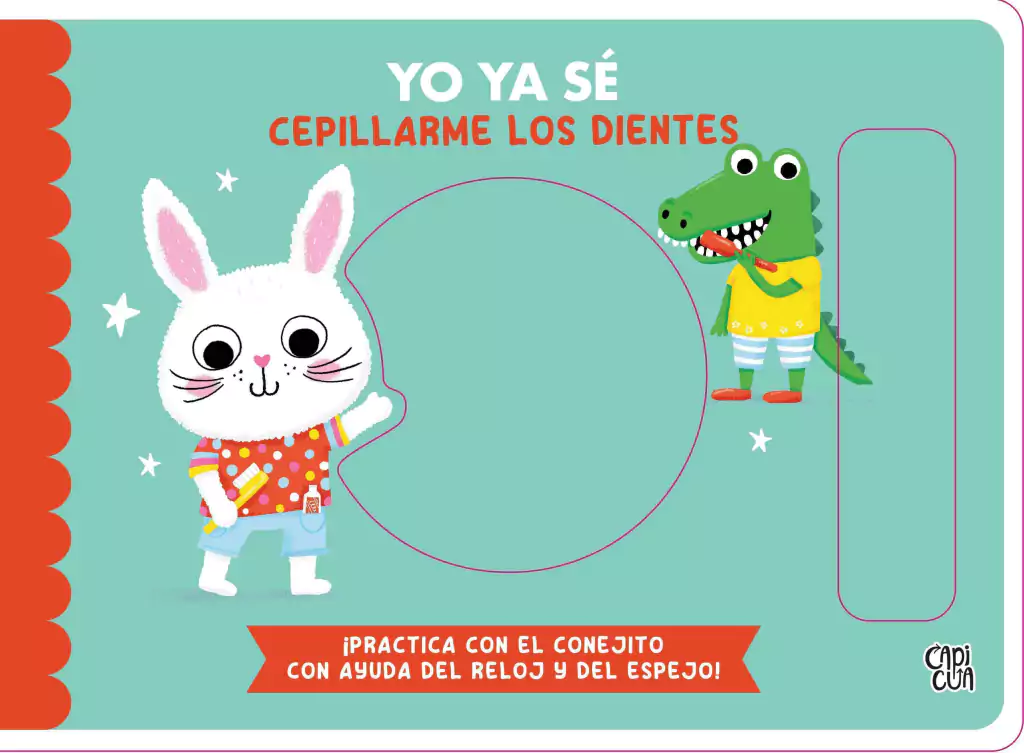 En lugar de presentar las indicaciones como un listado de pasos a seguir, los tres libros de esta colección enseñan las habilidades a través de un ameno diálogo entre un conejito protagonista de los tres títulos- con un amigo diferente en cada uno: un osito, un elefante y un cocodrilo. Yo ya se cepillarme los dientes trae un reloj de arena que indica el tiempo que debe dedicar el lector al cepillado para que esté bien hecho. También puede verse cepillándose en el espejo adhesivo en tapa.